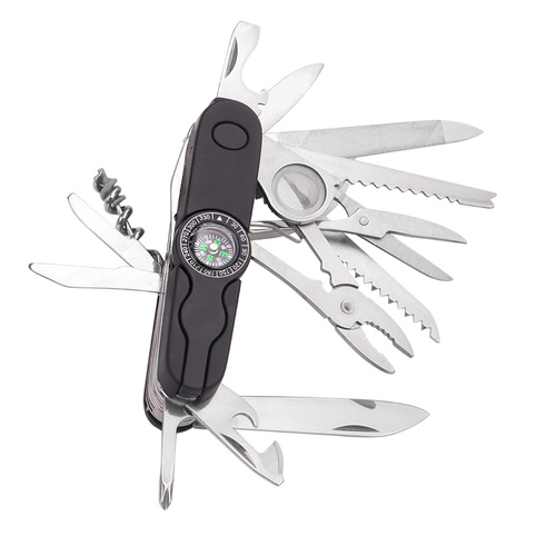 • Poręczny scyzoryk wyposażony w 25 narzędzi, m.in. obcęgi, wkrętaki, różne ostrza, lampkę i kompas. Przydatny zarówno w domu, jak i w terenie. Wykonany ze stali nierdzewnej, wyposażony w pochewkę z wodoodpornej dzianiny. Kolor: czarny.