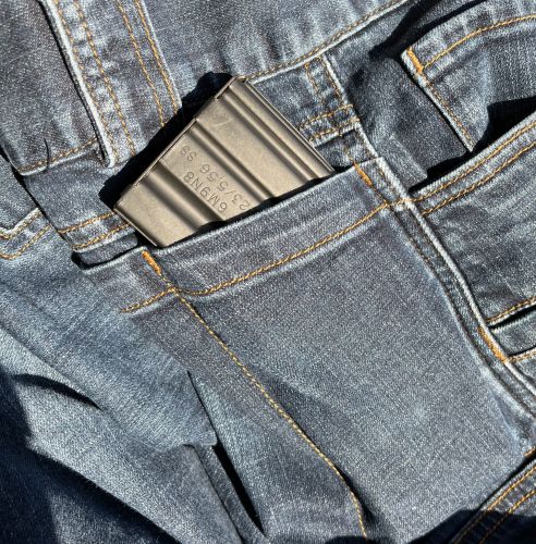 Wykonanie z 10 uncjowego denimu, wzbogaconego syntetycznym jedwabiem, przekłada się na dużą wytrzymałość materiału oraz rozciągliwość, przez co spodnie nie ograniczają swobody ruchów. Forma spodni oparta jest kompletnie o klasyczne wzornictwo jeansów, posiada więc karczek oraz klin poprawiający wytrzymałość. Rozlokowanie 9 kieszeni ma ułatwiać zarówno rozlokowanie przedmiotów EDC, jak i umożliwiać wykorzystywanie ich jako ładownic na magazynki do karabinków AR-15. Zarówno wkomponowane w przód wpuszczane kieszenie, jak i boczne, sąsiadujące z tylnymi są w stanie zmieścić po jednym magazynku typu STANAG.