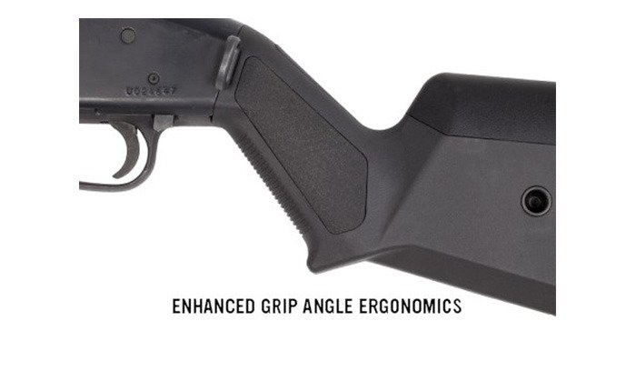 Chwyt charakteryzuje się wysoką ergonomię a teksturowane pokrycie oraz żebrowanie na froncie zapewnia wysoką kontrolę nad strzelbą.