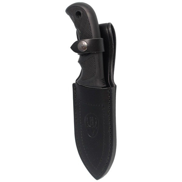 Etui - zapinane na zatrzask, wykonane z naturalnej skóry w kolorze czarnym z tłoczonym logiem producenta. Pochwę przeszyto na brzegach ozdobną nicią. Mocowanie do pasa lub oporządzenia umożliwia noszenie noża w pozycji pionowej.
