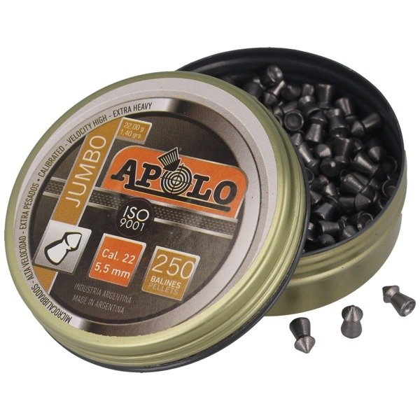 • JUMBO, EXTRA HEAVY .22, jeden z najcięższych nadkalibrowych śrutów firmy Apolo w kal. 5.52 mm . Wagę śrutu dobrano tak, że pasuje do wiatrówek pneumatycznych o największej mocy (FAC bez limitu energii) zarówno sprężynowych jak i PCP. Opakowanie 250 szt.