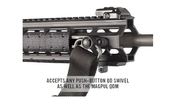 Gniazdo pozwala na stosowanie zarówno standardowego zaczepu QD jak i opatentowanego przez Magpul QDM. Profilowanie powierzchni wewnętrznej portu zapobiega niekontrolowanym obrotom i skręcaniu zawieszenia.