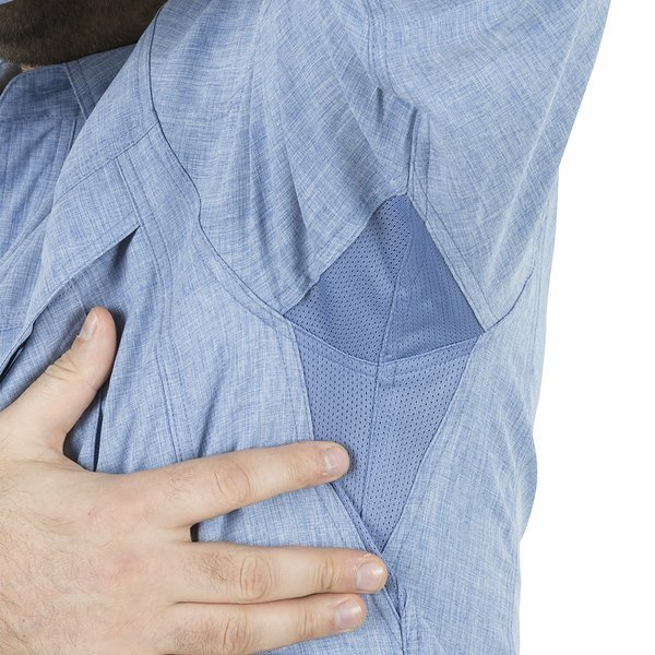 Materiał charakteryzuje się dobrym odprowadzaniem wilgoci, a współczynnik UPF 30 ogranicza przenikanie promieniowania UV. W strefie piersi zastosowano cztery kieszenie: dwie naszywane z klapkami zapinanymi na rzep oraz dwie płaskie kieszenie zamykane suwakami YKK®, rozmieszczone poniżej klapek. Pod pachami znajdują się wstawki wentylacyjne poprawiające wymianę powietrza w miejscach o podwyższonej temperaturze. Krój o profilowanej linii barków ułatwia zakres ruchu, a mankiety mają regulację obwodu. Na listwie umieszczono pętlę ułatwiającą odwieszenie okularów. Elementy zapięć wykorzystują guziki z subtelnym znakowaniem producenta.