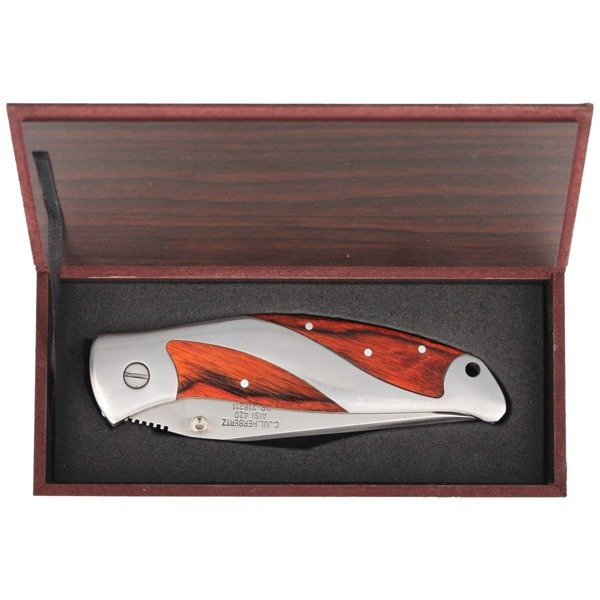 216211 - średniej wielkości klasyczny nóż składany niemieckiej marki Herbertz Solingen. Rękojeść okładziny ze stali nierdzewnej łączone z barwionym drewnem. Folder zapakowano w eleganckie prezentowe drewniane pudełko typu Gift Box - pomysł na prezent!