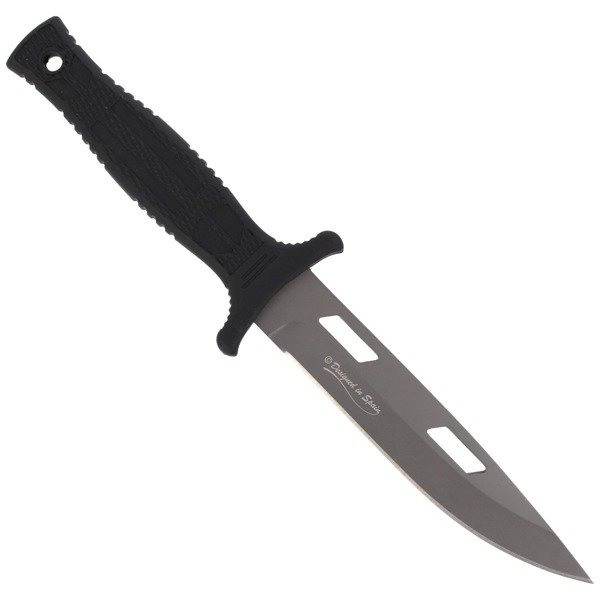 Bezpieczeństwo użytkowania noża zwiększają: jelec oraz ergonomicznie wyprofilowana rękojeść. W tylnej części rękojeści znajduję się otwór umożliwiający montaż linki zabezpieczającej.