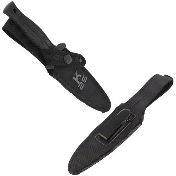 Pochwa - z nylonu balistycznego w kolorze czarnym z systemem Quick Release umożliwiającym szybkie wypięcie noża z pochwy. Etui posiada mocowanie do pasa lub oporządzenia za pomocą klipsa umożliwiające noszenie noża w pozycji pionowej.