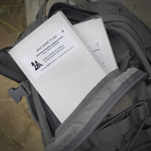 Do podgrzania potrawy służy bezpłomieniowy podgrzewacz chemiczny. Instrukcja jego obsługi w języku polskim znajduje się w pudełku. Aby przygotować gorące danie wystarczy tylko 10-15 minut i to niezależnie od panujących warunków.
