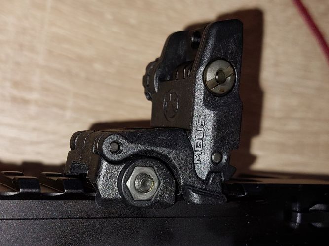 Wykonany z polimeru przeziernik typu flip up MBUS (Magpul® Back-Up Sight) wyprodukowany przez przodującego producenta akcesoriów do broni palnej, firmę Magpul Industries.