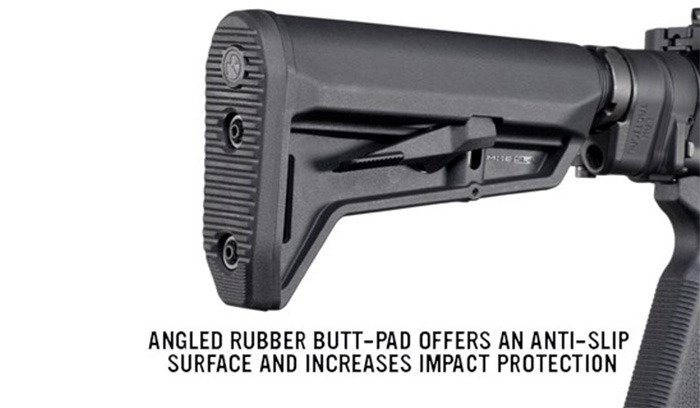Kompaktowa, gumowa stopka znakomicie amortyzuje odrzut i dzięki wyraźnemu teksturowaniu, zapewnia pewne podparcie. Duża powierzchnia przycisku ułatwia regulację, jest natomiast zabezpieczona przed przypadkowym zwolnieniem dzięki głębokiemu osadzeniu. Atrakcyjny design kolby sprawia, że znakomicie odświeży wygląd karabinka i sprawdzi się w konfiguracjach PDW.
