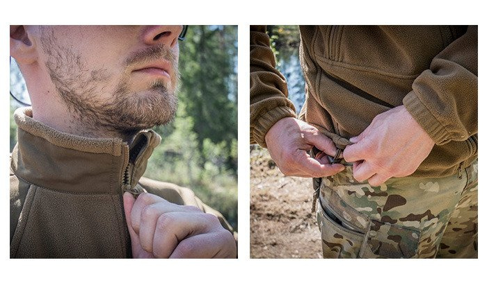 Piersiowe i naramienne kieszenie, wyposażone w organizery ułatwiają wygodne rozlokowanie przedmiotów codziennego użytku. Wykorzystanie dwukierunkowego głównego zamka YKK pozwala również na rozpięcie bluzy od dołu co pozwala na łatwy dostęp do kieszeni spodni lub np. broni przenoszonej na pasku.