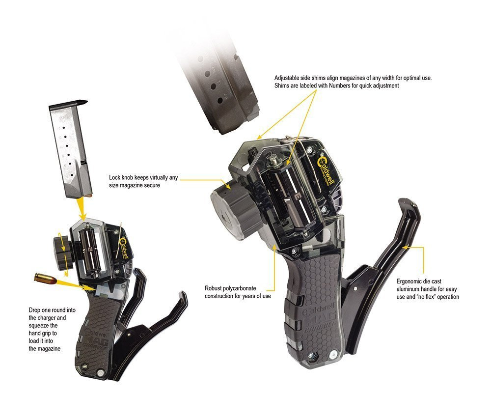 Dzięki przemyślanej konstrukcji urządzenie jest w stanie współpracować z większością magazynków do pistoletów w kalibrze .380 ACP, 9x19 mm, 10 mm Auto, .357 SIG, .40 S&W i .45 ACP. Ładowarka jest kompatybilna zarówno z jedno- jak i dwurzędowymi magazynkami.