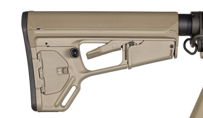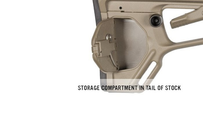 Obszerny przedział ukryty w kolbie pozwala na przechowywanie akcesoriów do czyszczenia, stoperów, oraz jest wymiarami idealnie przystosowany do pomieszczenia zbijaków .223 Rem. W tylnej części znajduje się port QD z możliwością przełożenia na drugą stronę. Ponadto frontowa część została wyprofilowana w sposób pozwalający na korzystanie z chwytów na zawieszenie Magpul ASAP® oraz ASAP® QD. Obustronna przelotka pozwala na zastosowanie pasów zawieszenia o szerokości 1" (2,54 cm).