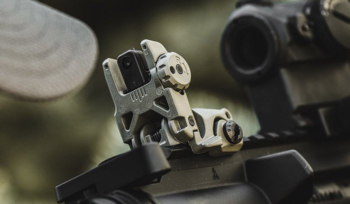 Wykonany z polimeru przeziernik typu flip up MBUS (Magpul® Back-Up Sight) wyprodukowany przez przodującego producenta akcesoriów do broni palnej, firmę Magpul Industries.
