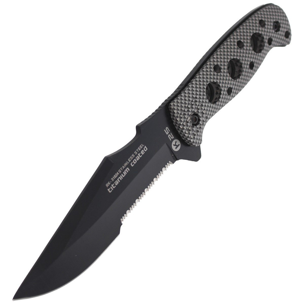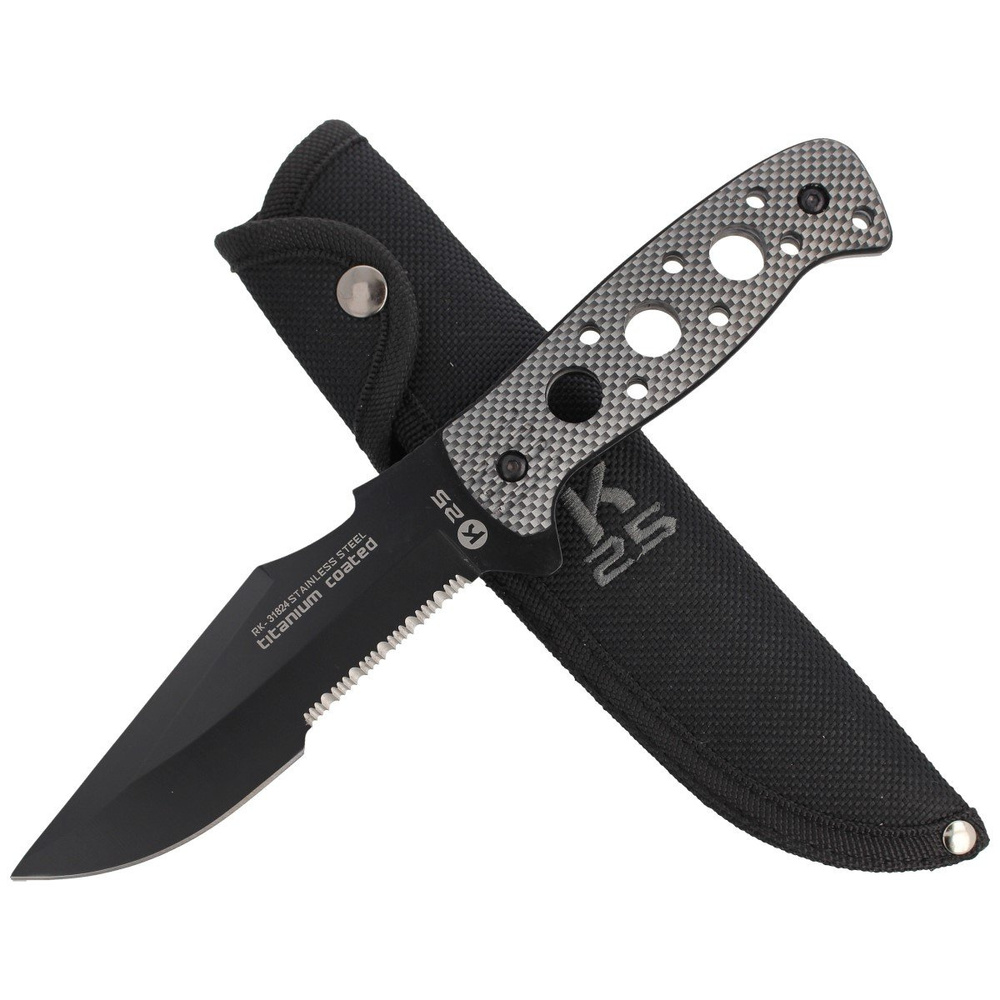 • Nóż taktyczny K25 / RUI CARBON FIBER Titanium Tactical nóż taktyczno-survivalowy ze stałą klingą o konstrukcji full tang, ze stali 440, z okładzinami z włókna węglowego.