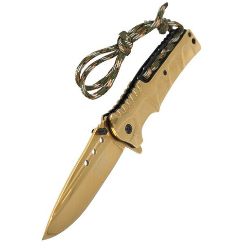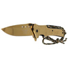 Rękojeść - ergonomiczna, w kolorze złotym z teksturowanymi okładzinami wzmacniającymi chwyt. Grzbiet okładek częściowo pokryty nylonowym oplotem (cord wrap) z nierozciągliwej linki paracord. Przykręcany śrubami torx, metalowy klips pozwala przenosić folder w pozycji tip-down (czubkiem do dołu). Spine Jimping karbowanie nacięcia na grzbiecie rękojeści zwiększają wygodę pracy nożem. W tylnej części chwytu otwór (lanyard hole) do mocowania linki zabezpieczającej.