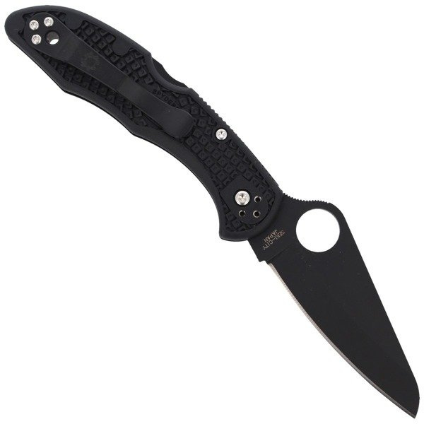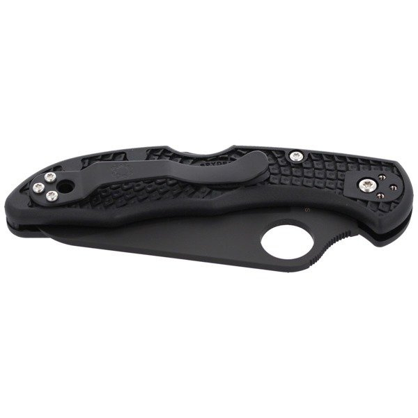 Głownia - o profilu Clip Point, grubości 2.5 mm. Klingę pokryto odporną na zarysowania, matową nierefleksyjną powłoką TICN (Non-Reflective Titanium Carbonitride) w kolorze black. Ostrze gładkie Plain wyprowadzono szlifem wklęsłym (Hollow Grind) umożliwiającym skuteczne i głębokie cięcia. Powiększone 14 mm okrągłe wycięcie w klindze SpyderHole (patent Spyderco) zwiększyło garb podparcia pod kciuk (karbowana rampa) oraz umożliwiło otwarcie noża mokrymi dłońmi oraz w rękawicy. Solidny Back-Lock z dodatkowym wycięciem projektu Boye Detent'a, zapobiegającym przed przypadkowym zwolnieniem blokady przy mocnym uchwyceniu noża.