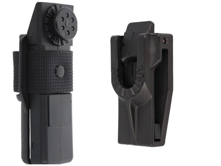 Kabura - opatentowana konstrukcja umożliwia obrót uchwytu o pełne 360° oraz blokowanie w jednej z 16 pozycji. Pałka może być przenoszona złożona lub rozłożona w pozycji pionowej, poziomej jak i innej dowolnej. Etui wykonano z ciężkiego (heavy-duty), utwardzanego polipropylenu w kolorze czarnym.