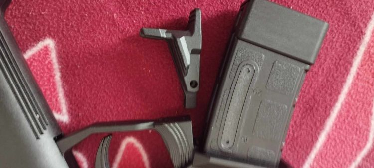 Konstrukcja została rozbudowana względem oryginału o biegnące wzdłuż kabłąka występy. Ułatwiają one korzystanie ze zrzutu przy użyciu ręki dominującej, zwłaszcza w przypadku kiedy użytkownik posiada drobne dłonie lub krótkie palce. Praktycznie prostopadła do magazynka płaszczyzna zrzutu pozwala na szybkie i pewne użycie nawet w rękawiczkach strzeleckich.