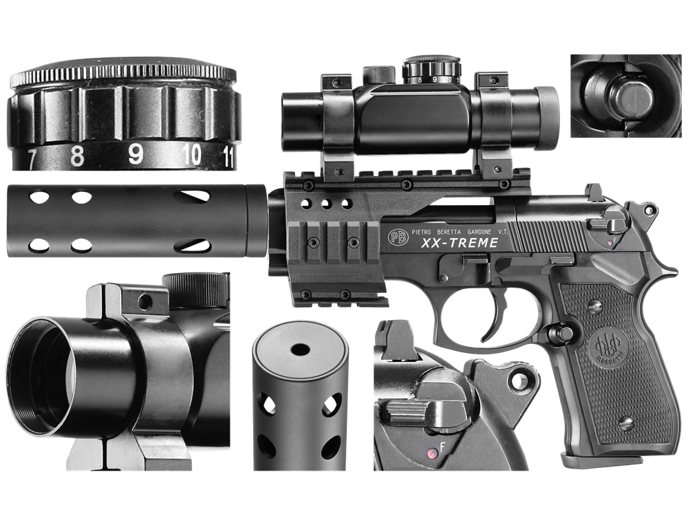 Beretta wyposażona została w szynę montażową przykręcaną do szkieletu pistoletu, która pozwala na zamontowanie dodatkowego osprzętu. Zawarty w zestawie celownik kolimatorowy Top Point ułatwia dynamiczne celowanie. Osiągi repliki zwiększa również zamontowany kompensator kryjący przedłużoną lufę, co ma korzystny wpływ na tor lotu śrutu. Cały system montażu można w szybki sposób zdemontować dzięki dołączonemu do zestawu śrubokrętowi. W miejscu magazynka w chwycie pistoletowym znajduje się miejsce na nabój CO2.