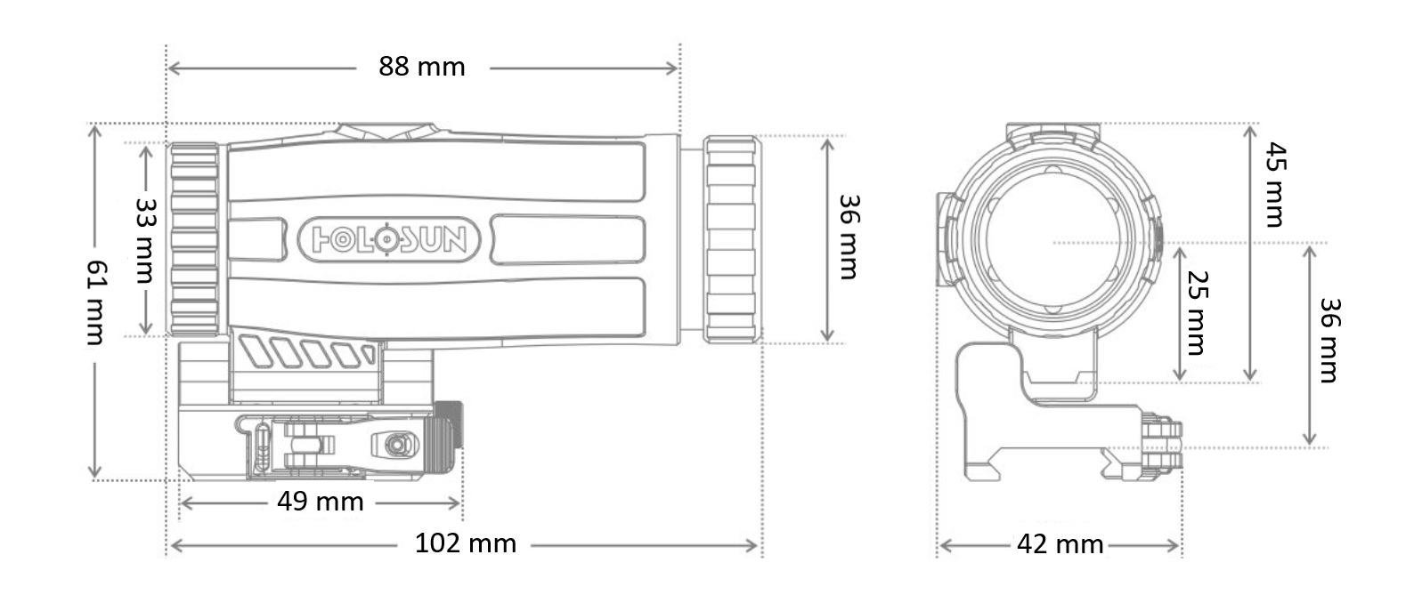 Powiększalnik jest osadzony na montażu Picatinny QD z funkcją flip-to-side. Pozwala to na błyskawiczne odchylenie powiększalnika na bok, gdy nie jest używany, i powrót do celowania bez powiększenia, przez sam kolimator. Dzięki dołączonym podkładkom dystansowym, HM3X jest kompatybilny z kolimatorami o wysokości osi optycznej Absolute Cowitness oraz Lower 1/3.