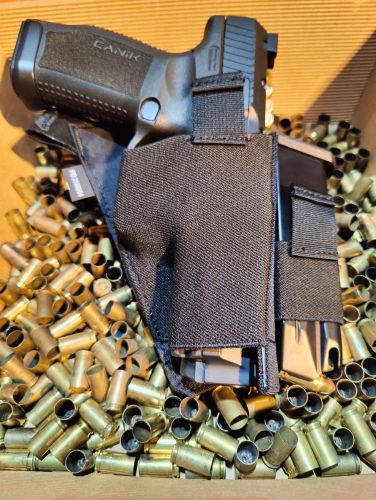 - Dwie obszerne pętle z elastycznej taśmy, do przenoszenia pistoletu oraz magazynka.