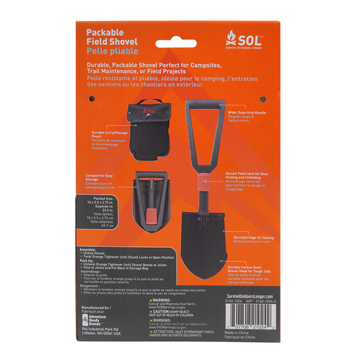 Saperka składana z pokrowcem od firmy Survive Outdoors Longer. Potrójny system składania saperki sprawia, że zajmuje ona niewiele miejsca w naszym turystycznym ekwipunku czy w plecaku wojskowym. Dzięki ząbkowanej krawędzi użytkownik może wykorzystać narzędzie jako improwizowaną piłę do drewna.