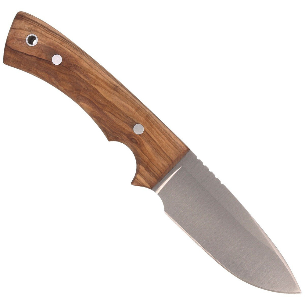 Rękojeśćpokryta okładzinami z naturalnego drewna oliwnego zapewnia wygodny i pewny chwyt. Finger Choil profilowane podcięcie pod palec wskazujący zwiększa panowanie nad nożem. W tylnej części rękojeści otwór na linkę lub rzemień.