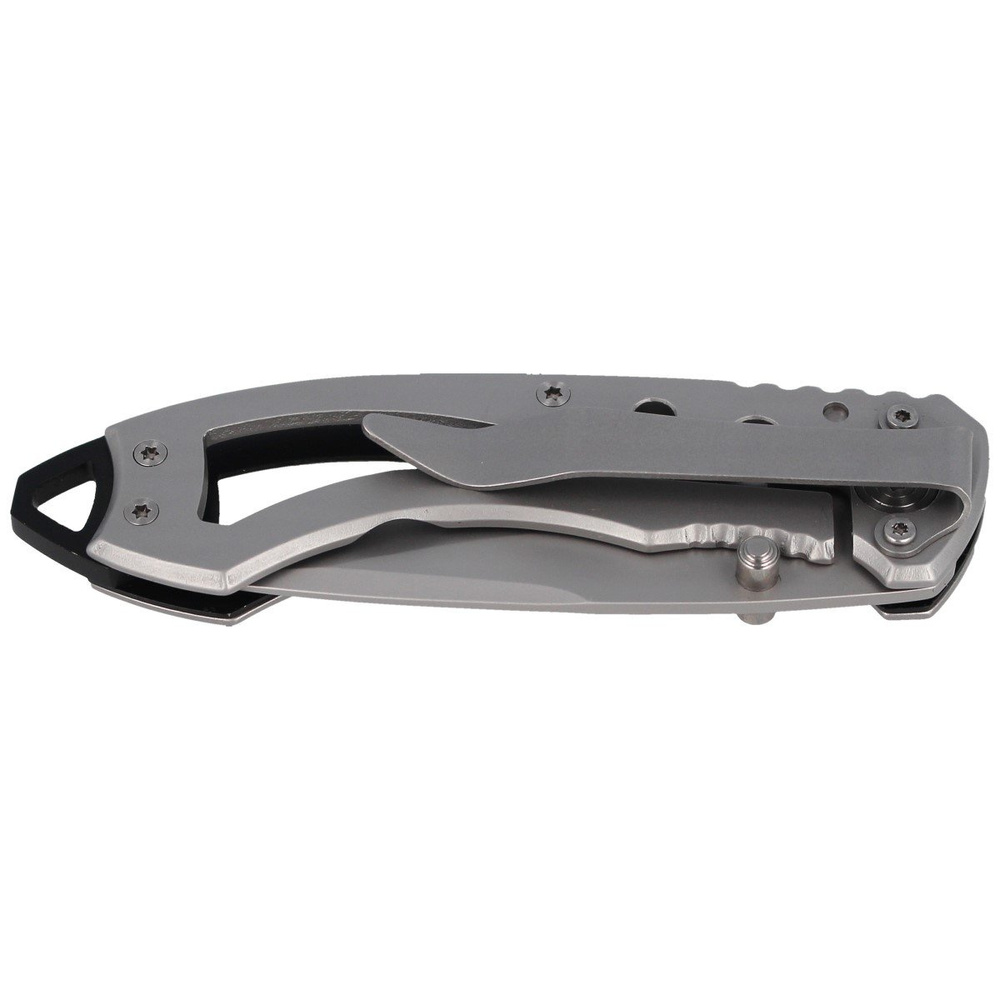 Rękojeść - profilowana rękojeść z aluminium zapewnia wygodny i pewny chwyt podczas pracy. Bezpieczeństwo użytkowania zwiększa zagłębienie w rękojeści które osłania palec wskazujący przy intensywnej pracy, jak również ząbkowane oparcie dla kciuka. Wygodne noszenie zapewnia sprężysty klips ze stali nierdzewnej umożliwiający łatwe mocowanie noża np. na pasie czy w kieszeni. Na końcu rękojeści znajduje się otwór umożliwiający zamontowanie linki zabezpieczającej.